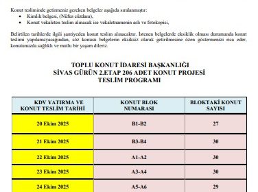 Sivas’ın Gürün ilçesinde yapımı tamamlanan 2. Etap 206 Konut Projesi kapsamında yer alan konutların teslim süreci başlıyor. Konutların teslim işlemleri, 20-31 Ekim 2025 tarihleri arasında aşağıda beli...
