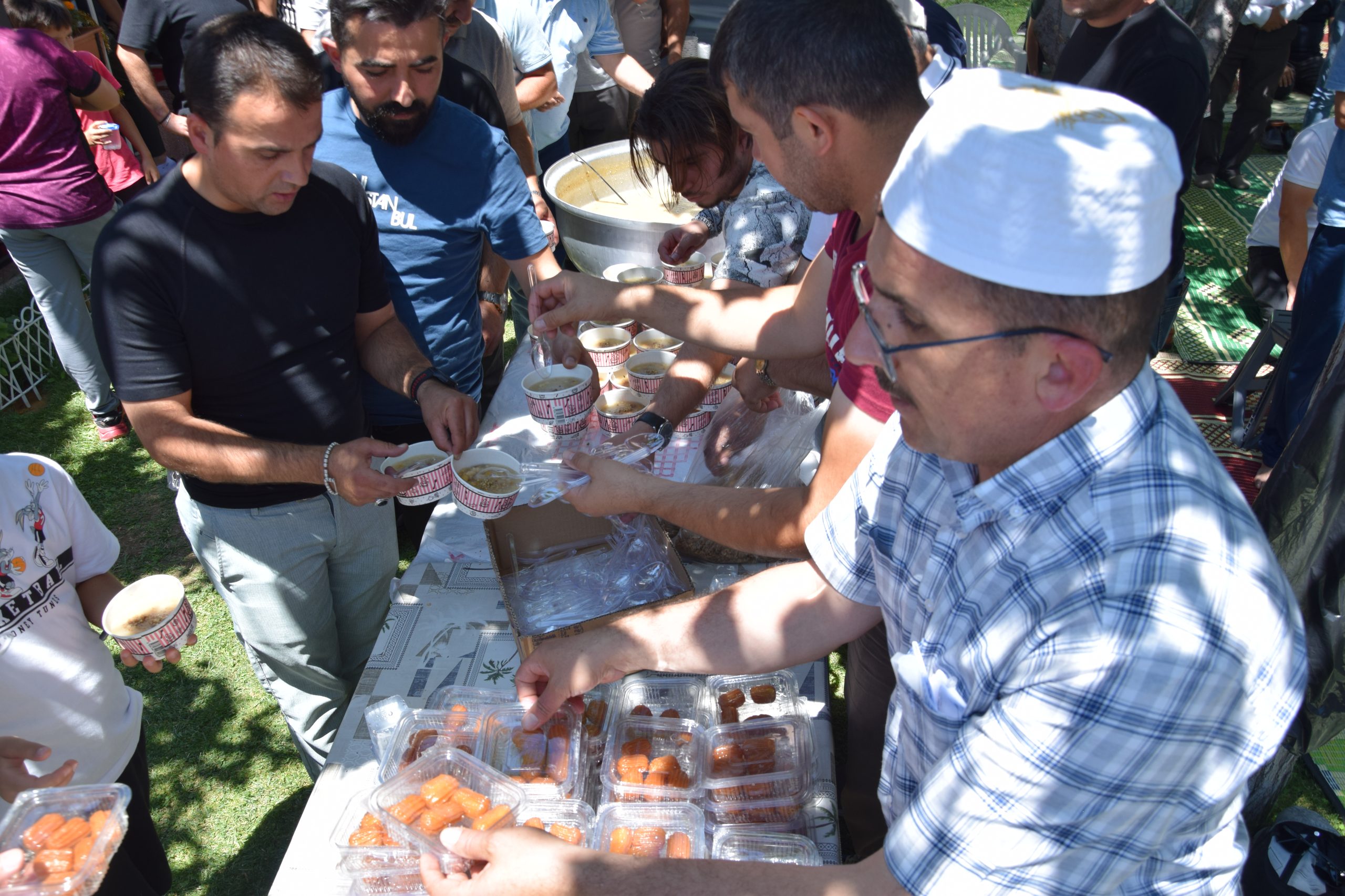 Etkinlikte kazanlarda hazırlanan aşureler, cami cemaati ve çevredeki vatandaşlara ikram edildi. Paylaşmanın ve dayanışmanın önemine dikkat çeken organizasyonda, muharrem ayının manevi atmosferi cami avlusunu sardı.