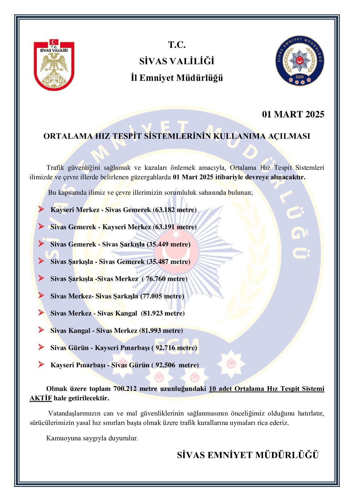 Sivas Valiliği ve İl Emniyet Müdürlüğü tarafından yapılan açıklamaya göre, trafik güvenliğini sağlamak ve kazaları önlemek amacıyla il genelinde 10 farklı noktada Ortalama Hız Tespit Sistemi kuruluyor...